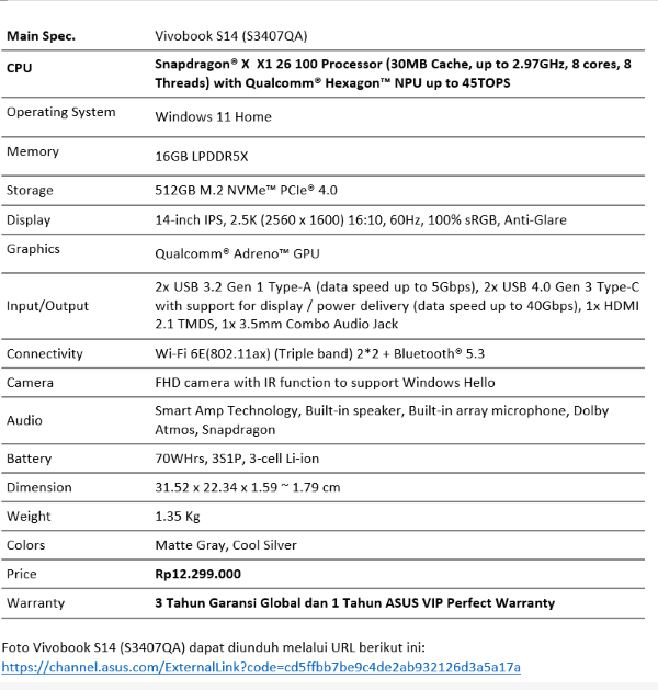 Sebagai tambahan, ASUS juga menyertakan program perlindungan ekstra bernama ASUS VIP Perfect Warranty. Program ini memberikan jaminan penggantian komponen atas kerusakan akibat kelalaian pengguna di tahun pertama pemakaian. Lewat perlindungan menyeluruh baik dari sisi desain maupun layanan, Vivobook S14 menjadi pilihan tepat bagi kamu yang membutuhkan laptop tangguh dan siap menemani aktivitas di mana saja.(*/yul/adv)