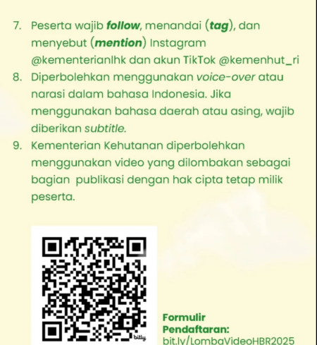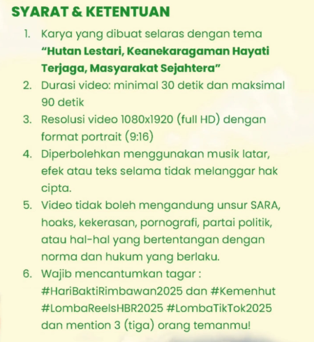 Jangan lupa gunakan hashtag: #HariBaktiRimbawan2025 dan #Kemenhut #LombaReelsHBR2025 #LombaTikTok2025 dan mention 3 (tiga) orang temanmu!
